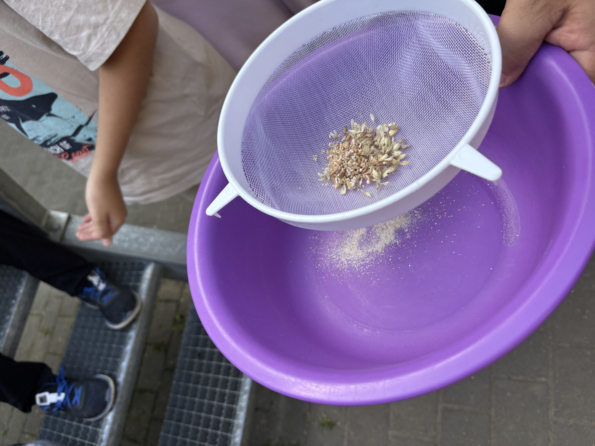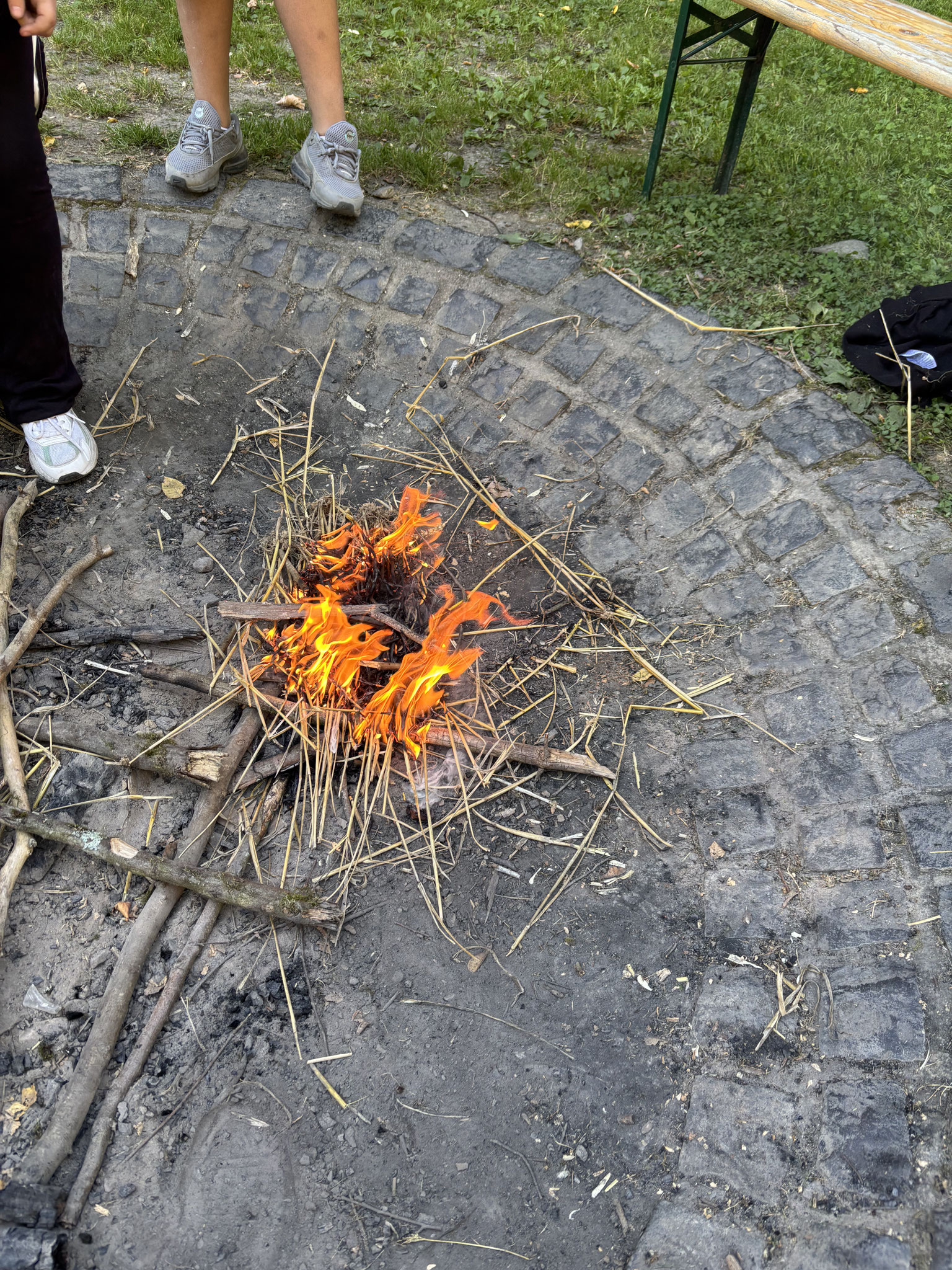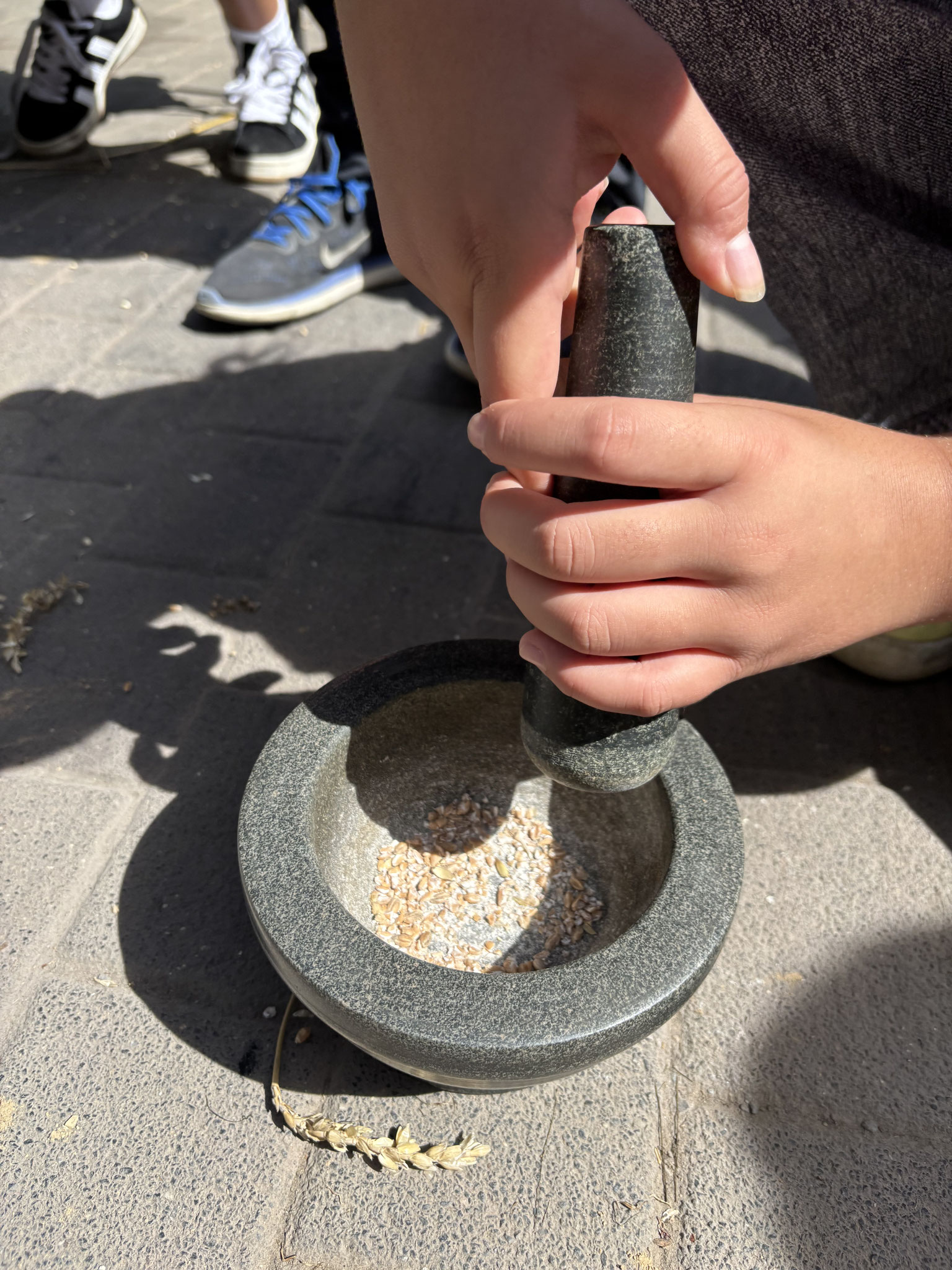 Wir haben aus Weizenkörnern Mehl gemahlen, Feuer mit Feuersteinen gemacht und Stockbrot gegrillt.