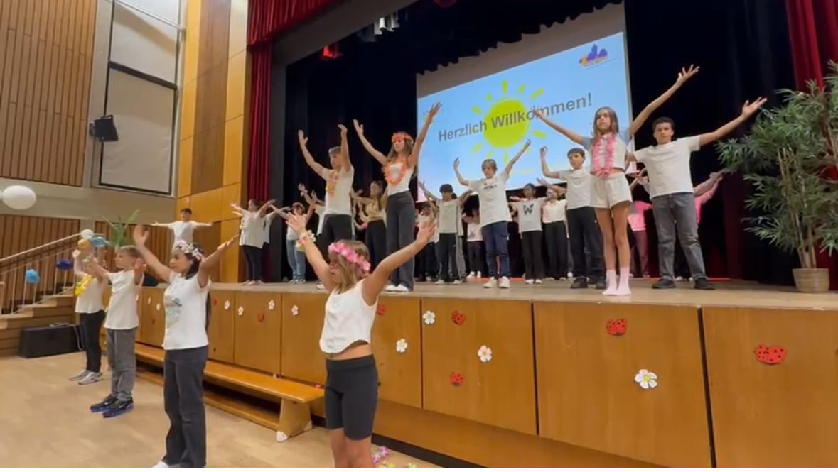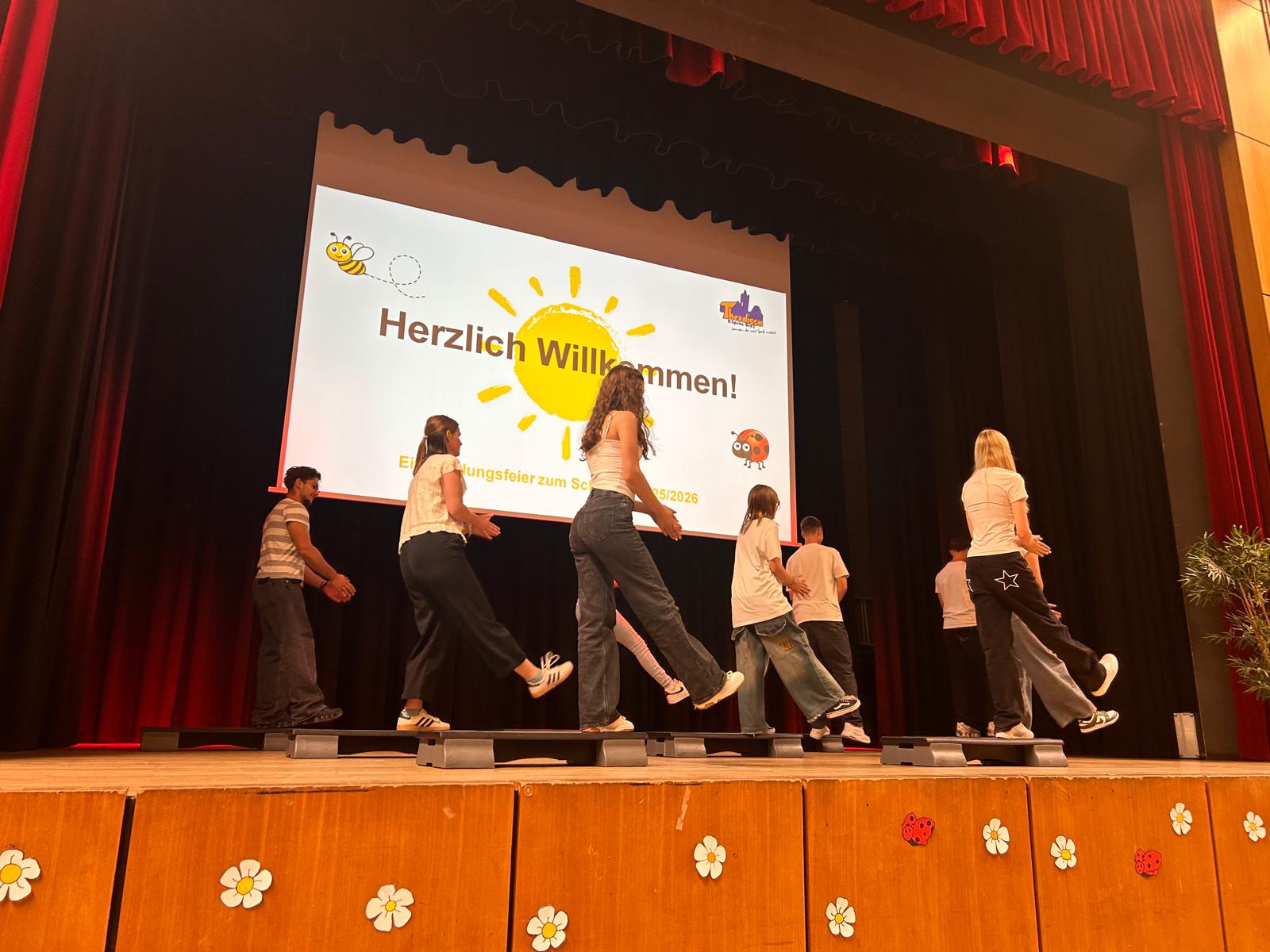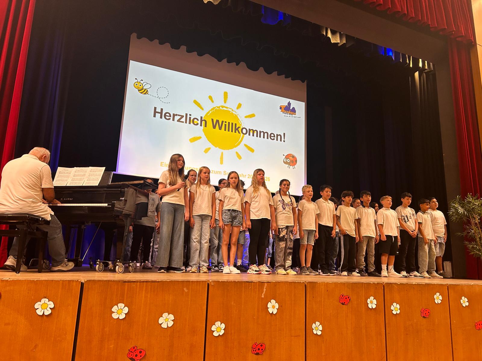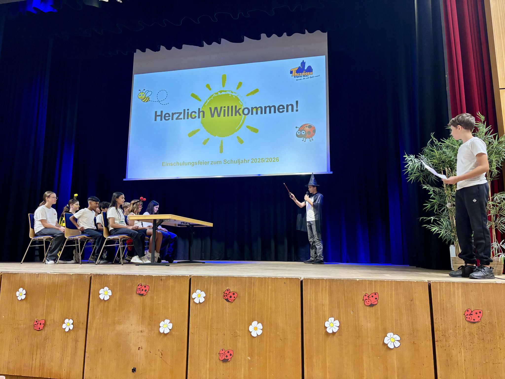 Die Einschulungsfeier fand in der sommerlich geschmückten Aula statt. Leider wurde das Programm immer wieder von einer "Biene" und einem "Marienkäfer" unterbrochen, die die Aula für sich beanspruchen wollten und für viele Lacher sorgten 🐞🐝.